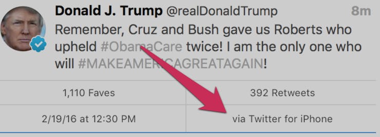 If Trump is indeed tweeting from an iPhone, it’s a relatively fresh hypocrisy. An October 2015 New York Times piece on the Donald’s Twitter strategy reported that he used a Samsung Galaxy. That’s in line with his pre-iPhone 6 history of slamming the company for refusing to make screens that meet Trump’s now well-documented and pathological demands for hugeness.