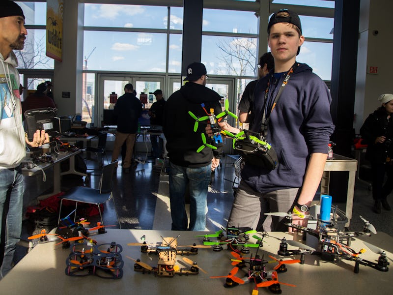 There’s a mesh cage in the middle of the exhibition floor that separates the drones from the kids, as though the buzzing devices were exotic predators hungry tiny towheaded scalps. They aren’t, but they’re objects of wonder for this crowd, like crowds everywhere. It’s the Day of Drones at New Jersey’s Liberty Science Center, and everyone — the parents, the little kids, the dude tightly buttoned-down in black who surreptitiously slides a vape pen from his ripped skinny jeans and takes a drag while tending his quadcopter — is high on drones.