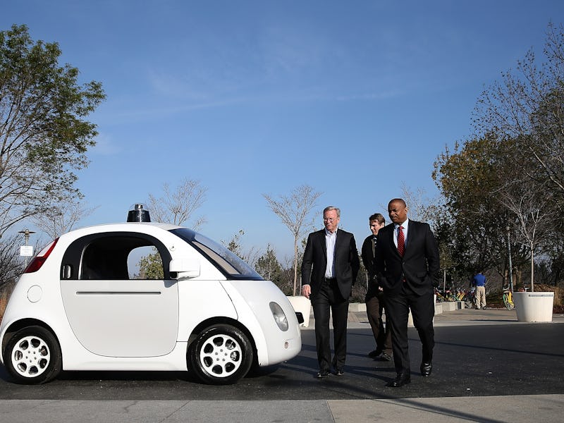 .S. Transportation Secretary Anthony Foxx (L) and Google Chairman Eric Schmidt (R) inspect a Google self-driving car at the Google headquarters.