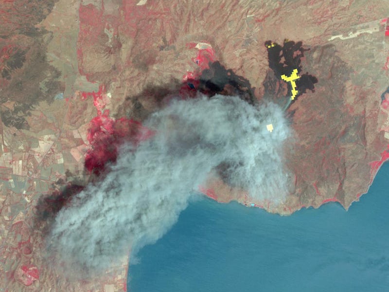 For example, the image above captures the March 2016 eruption of Nicaragua’s Momotombo volcano, in both visible and thermal infrared bands. The ash plume is the blue-gray stuff, while the thermal infrared bands illustrate lava flows in yellow. The summit crater of the volcano is highlighted in white, and vegetation around the area is shown in red.