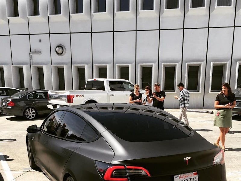 The matte-finished Tesla — murdered-out in all-black wheels and windows — is, however, subtly flashy. The term “murdered-out” is used by car fans to describe rides that are completely black in appearance, ostensibly like the grim reaper. Murdered-out cars are seldom sold as such. Instead, they’re blacked-out through custom, aftermarket work: black rims are added, windows and headlights are tinted, and (if needed) an all-black paint job is slapped on. The murdered-out Tesla seen rolling through California may be the same one Tesla showed off at its Model 3 unveiling event, though it’s still unclear whether the car’s tint job and rims will be offered as standard options. (And we’d like to see those headlights dimmed a little, too.)