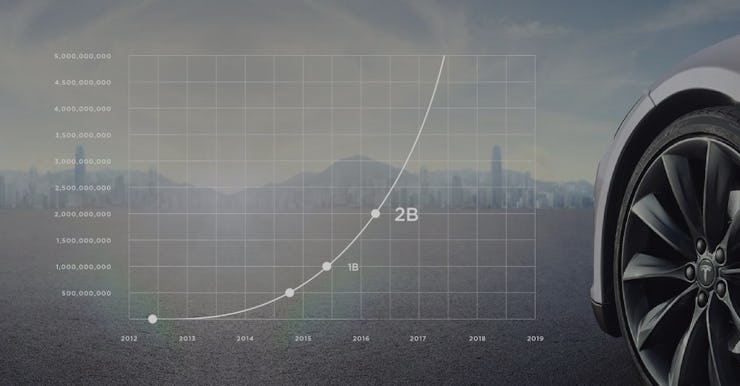 The company tweeted a graph that predicts exponential growth in the number of miles traveled moving forward, as users purchase cars and the range of the batteries increase. It took Tesla between mid 2012 and mid 2015 to reach its first billion miles traveled, and in less than a year, drivers doubled that number to 2 billion.