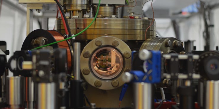 What they ended up with was an eight millimeter-long and four-millimeter-in-diameter ion trap with gold plates and electrodes that sequestered the lone calcium atom (but any charged atom could do the job) inside an electromagnetic field. Two lasers point at the ends of the trap, one heating up the atom and the other cooling it down. This fluctuation in temperature drives the ion to create an ever-increasing harmonic oscillation — like a sound wave. It’s the same idea as larger thermal engines that rely on the gas or liquids to generate mechanical work, except in this case there’s just one particle, Roßnagel explains.