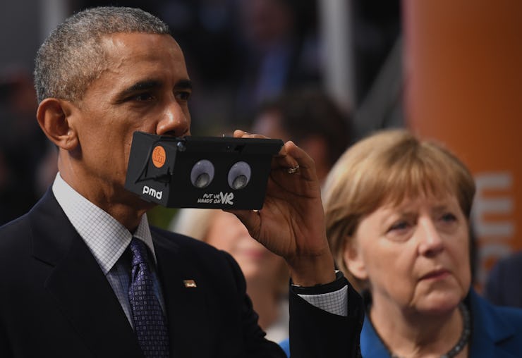 President Barack Obama tried his first augmented/virtual headset on Sunday while touring a technology trade show in Hannover, Germany, along with German Chancellor Angela Merkel. The PMD device’s Google Cardboard-like exterior equips with a Samsung Galaxy S7 and an external 3D camera to provide both digital immersion and reality alteration.