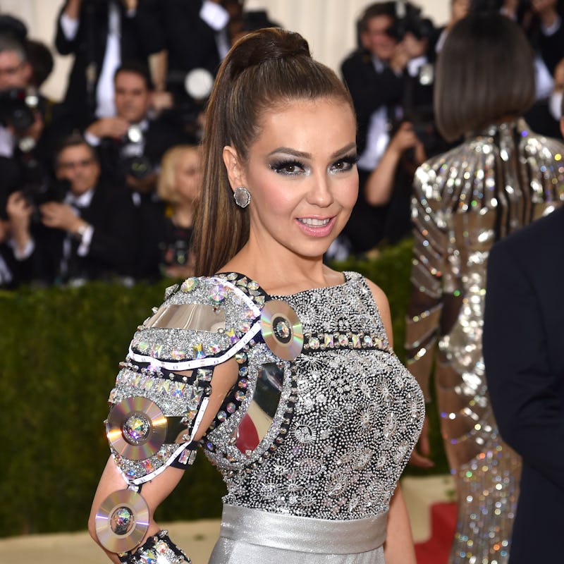 The queen of Latin pop, Thalia, brought the technology of the present and the future together with a fantastic shoulder pauldron that made its way down her arm covered in crystals and what look to be repurposed CDs.