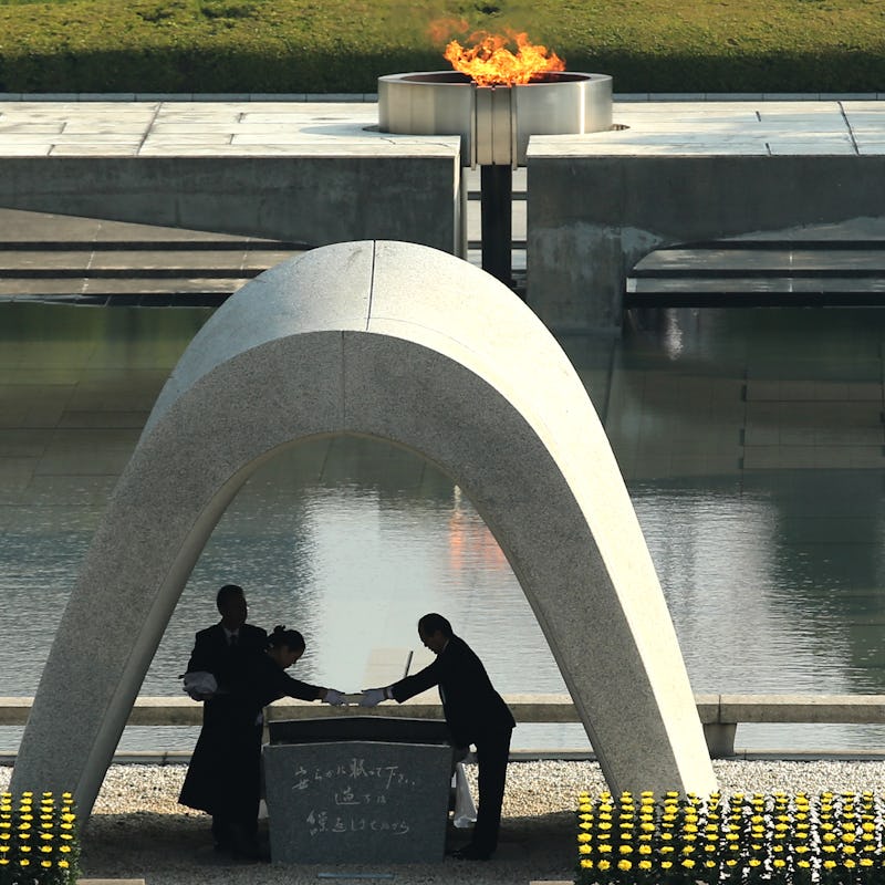 Students visit the Memorial Park next to Hiroshima Peace Memorial Museum on April 21, 2016 in Hiroshima, Japan. The park and museum are dedicated to the legacy of Hiroshima as the first city in the world to suffer a nuclear attack, and to the memories of the bomb's victims who are believed to number as high as 140,000.