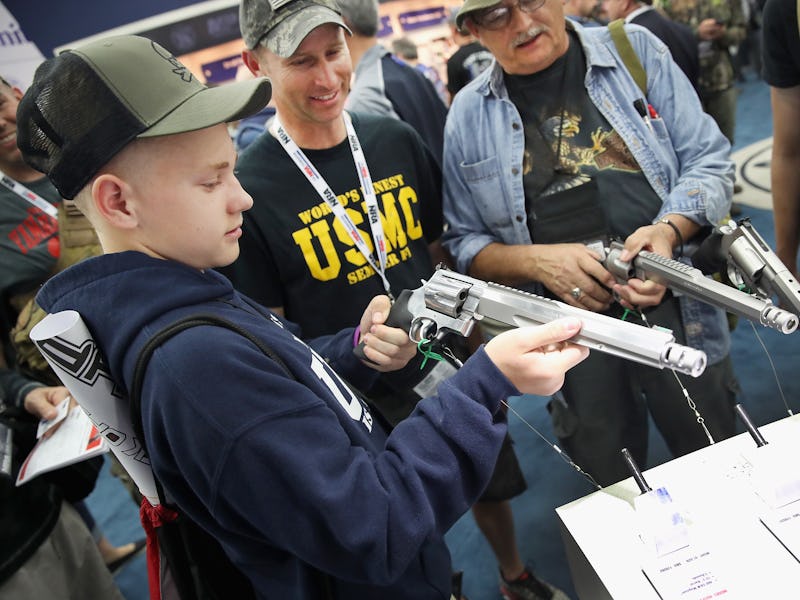Tyler Burton tries out an M&P 15-22 Sport rifle at the Smith & Wesson booth at the 2016 National Shooting Sports Foundation's Shooting, Hunting, Outdoor Trade (SHOT) Show at the Sands Expo and Convention Center on January 19, 2016 in Las Vegas, Nevada.