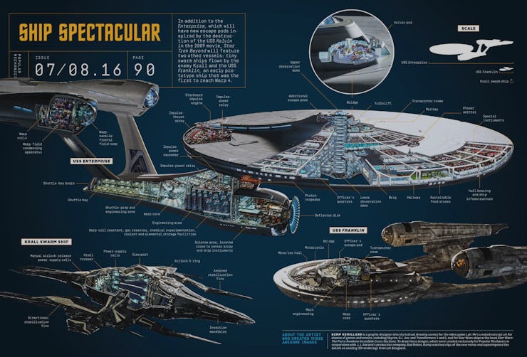 Popular Mechanics revealed slick new cutaway images of the various fictional starships from Star Trek Beyond. This includes the evil Krall Swarm Ship, the Enterprise, and a smaller Star Fleet ship, called the U.S.S. Franklin.
