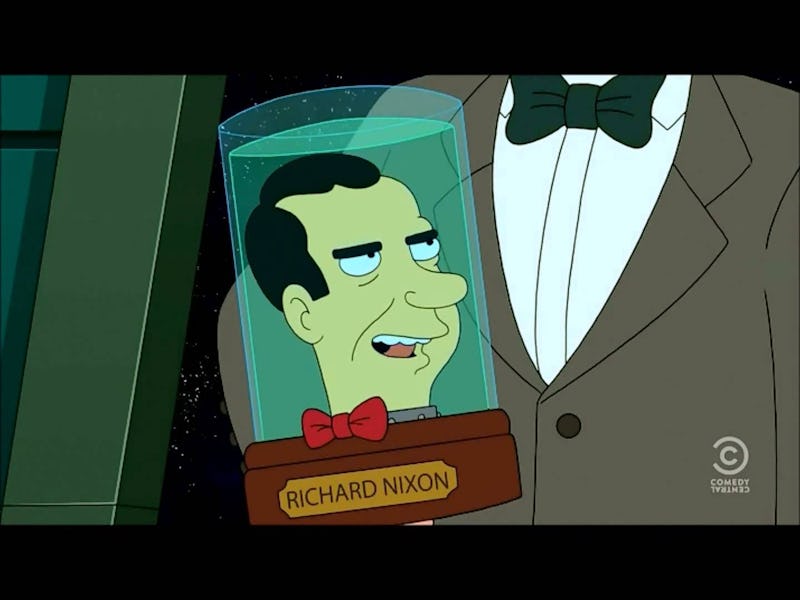 The chaos of that Futurama episode — which ends with the Nixon head stomping through Washington D.C. in a gigantic missile-firing bionic body, screaming “Who’s kicking who around know!? — probably won’t happen in real life if Trump gets elected. But who knows, at the rate we’re going we can’t really count it out. One vote does make a difference. You don’t want Nixon’s head being elected President a third time, do you?