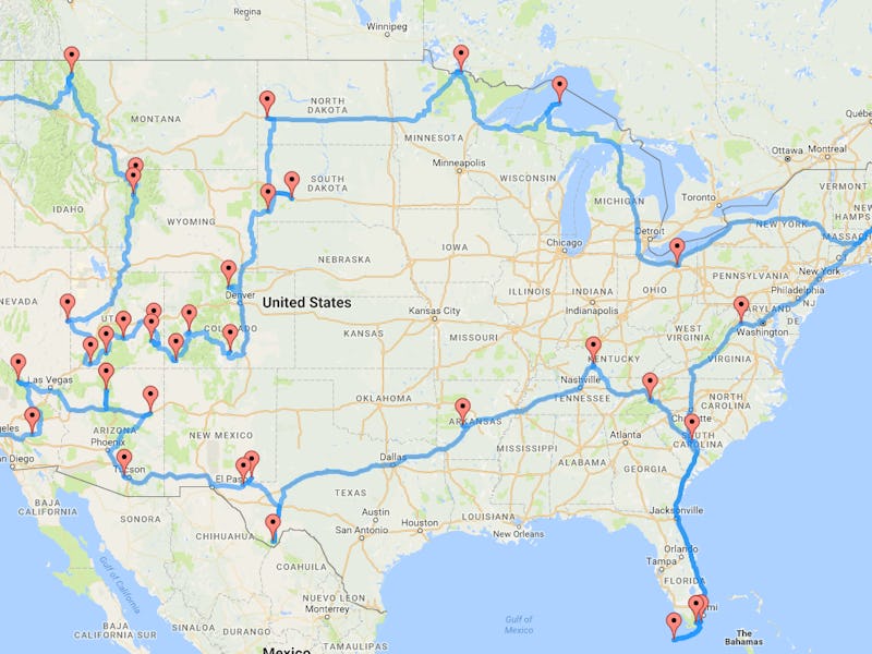 Randy Olson, a researcher at the University of Pennsylvania, has calculated a route that visits all 47 national parks in the 48 contiguous states. It covers some of the most gorgeous sites found in North America: the Grand Canyon, Death Valley, the Everglades, and the Rocky Mountains all make an appearance. In all, the trip spans 14,498 miles and, by Olsen’s estimations, would take about two months to complete.