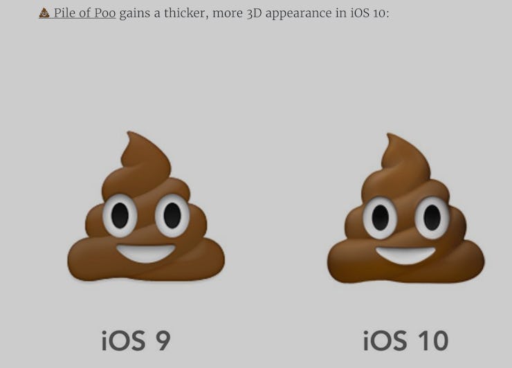 Finally, it’s impossible to describe the change to everyone’s favorite smiling fecal emoji better than Emojipedia did, so let’s just quote them here: “💩 Pile of Poo gains a thicker, more 3D appearance in iOS 10.”