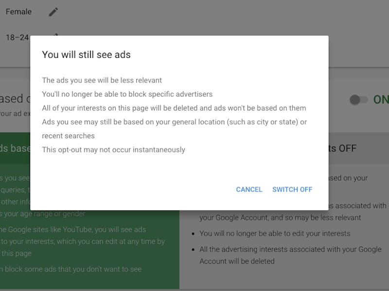 According to a pop-up that appears when you opt-out, the changes won’t occur “instantaneously.” It’s also important to note that you will still see ads on your Google services — they’ll just be based on less user data.