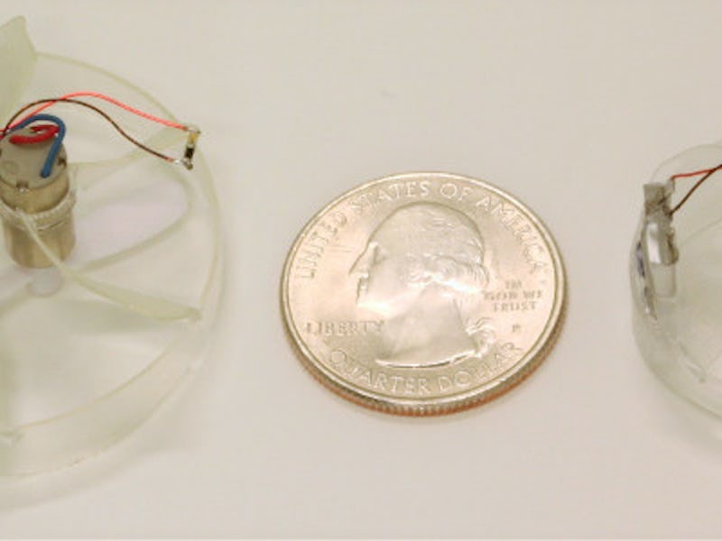 Piccolissimo — Italian for “tiniest” — is actually the name of two devices. The first consists of little more than a propeller, a power source, and an infrared receiver that tells it how fast to spin; the whole thing is about the size of a quarter. The other version has some extra parts that allow it to maneuver, and it’s about a centimeter wider than its little brother.