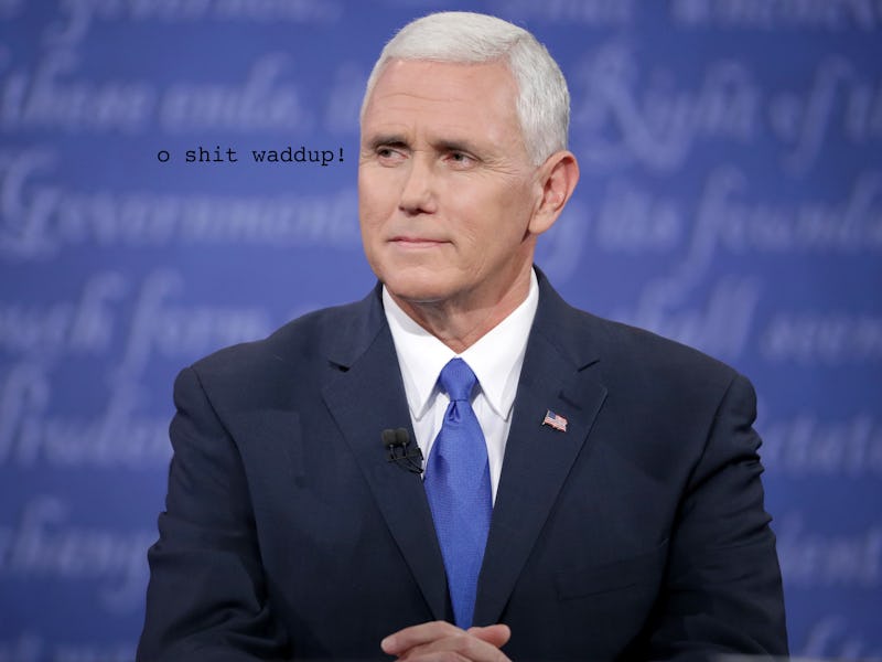 A cursory search for “Mike Pence Memes” doesn’t lead to an abundant stash of LOLs like those his predecessor inspired. Part of that, of course, is that Pence isn’t even vice president yet. America’s dutiful meme-smiths have had eight years to get to know Biden, while Pence is a relative newcomer on the national stage. Most of the hits for memes about the governor of Indiana have to do with his role as the Roadrunner to Biden’s Coyote in the current crop of memes. Know Your Meme catalogs a few flash in the pan memes from smaller incidents throughout the campaign, like Pence’s “that Mexican thing” line from the VP debate and the original, pornographic Trump/Pence logo.
