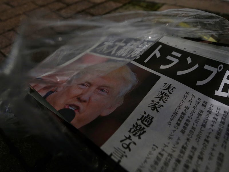 NEW YORK, NY - NOVEMBER 17: Prime Minister of Japan Shinzo Abe speaks to reporters following a meeting with President-elect Donald Trump November 17, 2016 in New York City. Trump and his transition team are in the process of filling cabinet and other high level positions for the new administration. (Photo by Drew Angerer/Getty Images)
