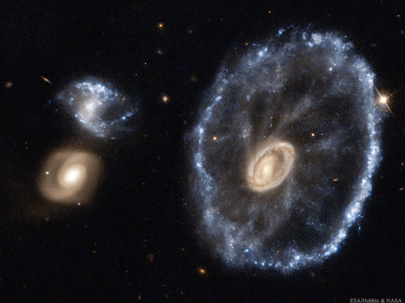 All sorts of weird stuff can happen when two galaxies collide into one-another. Sometimes they form weird cosmic eyes, sometimes they form something that just looks like a blob. Hubble captured another result: a giant galactic wagon wheel.