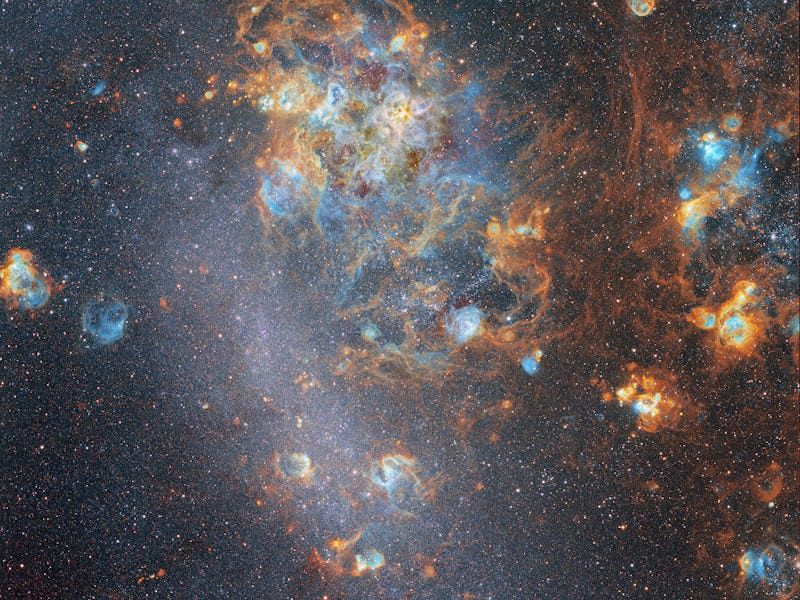 The Milky Way is not the only resident in our cosmic neighborhood; it is actually part of a larger collection of galaxies dubbed the Local Group. The Milky Way and the neighboring Andromeda Galaxy — two galactic behemoths in our cosmic community — are surrounded by a swarm of smaller galaxies. The most well-known are the Large and Small Magellanic Clouds, and the duo is easily be spotted with the naked eye from the southern hemisphere. The LMC, in particular, is approximately 180,000 light-years from Earth, nestled in the constellation Dorado.