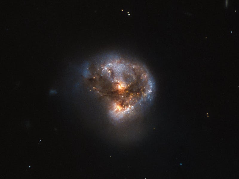 The galaxy is comprised of two distinct two parts — a northern core (dubbed IRAS-16399N), and a southern core (dubbed IRAS-16399S) — which couldn’t be more different. The southern core is essentially a humongous star factory, churning out embryonic stars at a staggering rate, while the northern core harbors a supermassive black hole, nearly 100 times more massive than the sun.