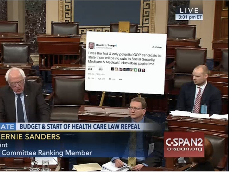 On Wednesday afternoon, while debating the repeal of Obamacare, Bernie Sanders got a little creative with a huge print-out of a tweet from President-elect Donald Trump. While it might appear humorous at first, Sanders used the visual aid to grab people’s attention and call out Trump for flipping on promises he had made about healthcare.