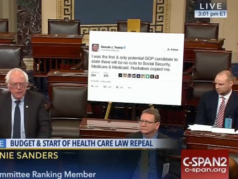 On Wednesday, Senator Bernie Sanders (D-VT) brought a large poster displaying a tweet from President-elect Donald Trump to the Senate floor. Sanders was hoping to keep Trump accountable for past promises during the debate over healthcare. In the tweet, Trump points out that he is “the first and only potential GOP candidate to state there will be no cuts to Social Security, Medicare & Medicaid.”