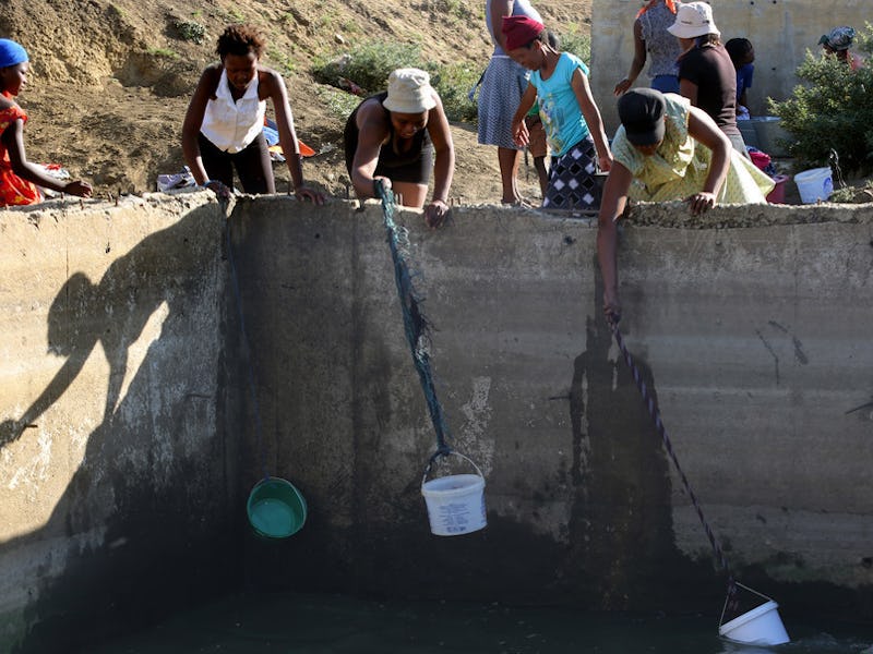 An elderly woman drinking water after waiting hours in line for it in January 2016 in South Africa.