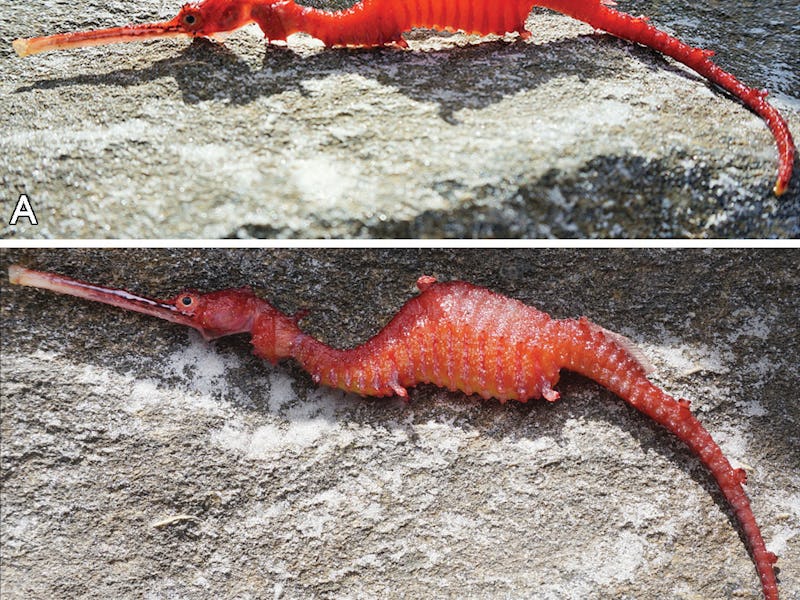 The other two species of seadragon, the common seadragon (Phyllopteryx taeniolatus) and the leafy seadragon (Phycodurus eques), have been well-documented by scientists. It wasn’t until 2015 that Stiller, Wilson, and Rouse described the ruby seadragon in scientific literature. But they only had museum specimens to work with. Their new study published Friday in the academic journal Marine Biodiversity Records documents their successful search for the elusive sea creature around the Recherche Archipelago in western Australia.