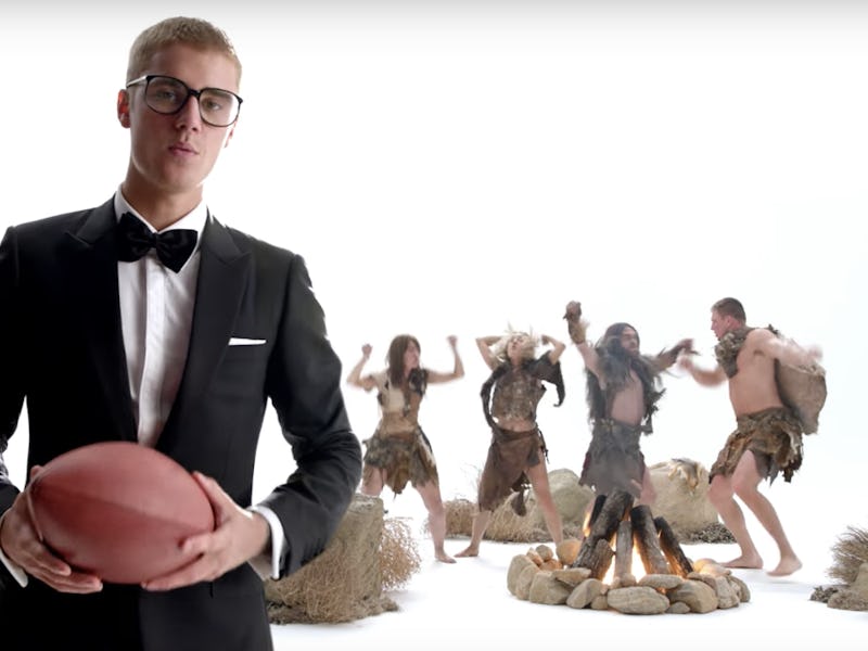 In the ad, released on Friday, a bespectacled Bieber, explaining how humans celebrate, says, “First there was the high five.” The camera cuts to New England Patriot Rob Gronkowski high-fiving another cave man. “Then, there was the ‘Gronk spike,’” he adds as Gronkowski slams a football into the ground. He proceeds to describe a series of dance moves, which are all variations on the “shimmy.” These, he concludes, add up to the key elements of human celebration. He isn’t wrong.