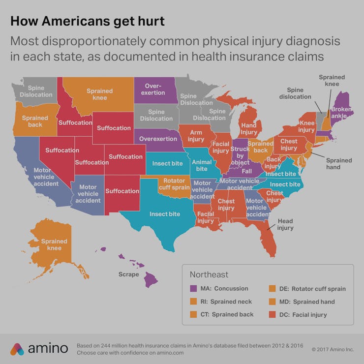 On Wednesday, insurance company Amino released maps detailing the most common injuries in all 50 states. For the rest, these maps provide a fascinating look at how Americans from different states tend to wind up at the doctor’s office.