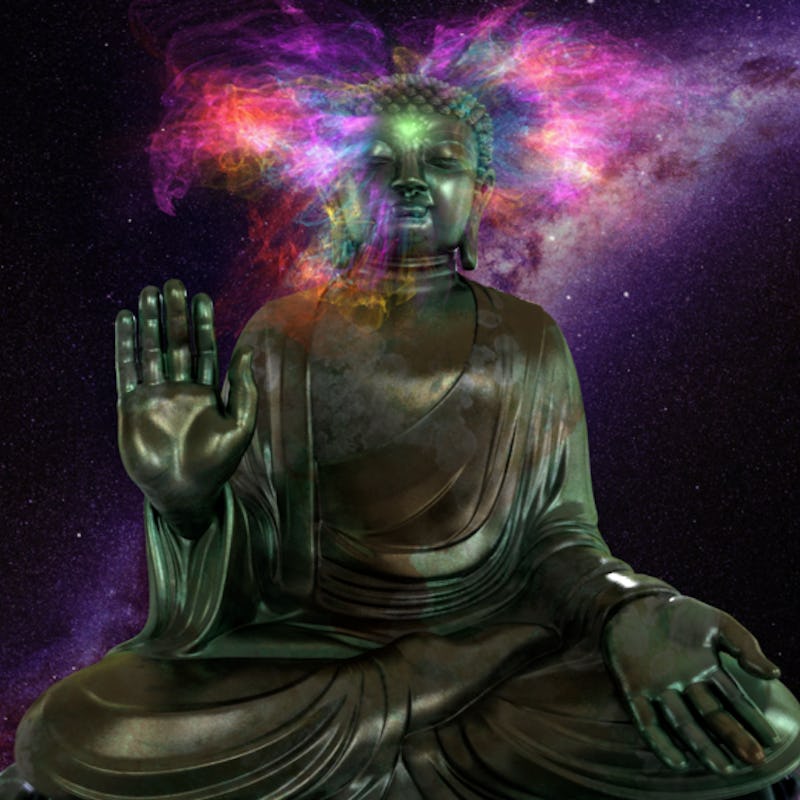 Suspended in space now, floating among waves of color on endless blackness, I contemplate a hairy ball of light that resembles an image of a technicolor neuron. In another life, it might have made a fine desktop wallpaper. But when you confront the true nature of yourself — in the words of Deepak Chopra, my true essence is “genderless, nationless, and ageless” — space doesn’t offer the support you need. My physicality was all I’d had left, and Deepak Chopra, that bastard, had stripped it away. I am scared stupid without my shell, and I’m powerless as a green-gold Cupid’s bow, huge as the moon, rises ominously before me. I shrink as it gives way to Buddha’s upper lips — I see it all now — a massive moss-green idol with no eyes and its right hand raised as if I were a fly to crush. Deepak Chopra says that my being can’t die, and now I believe it, because what I once thought was my being would have died from fright by now, yet here I am, alive as fuck.
