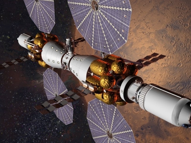 To get it into space, NASA will leverage the Orion deep space capsule and the Space Launch System, a launch vehicle. This spacecraft orbiting Mars will have Orion capsules on either end, as well as laboratory modules. This six-person mission would last about three years.