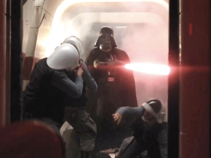 On the spaceship Tantive IV, the rebels await the oncoming stormtrooper assault in what appears to be the very same corridor they fled into just before. The mixture of fear and determination on their faces takes on new meaning when considering the fate that befell their comrades mere moments ago.
