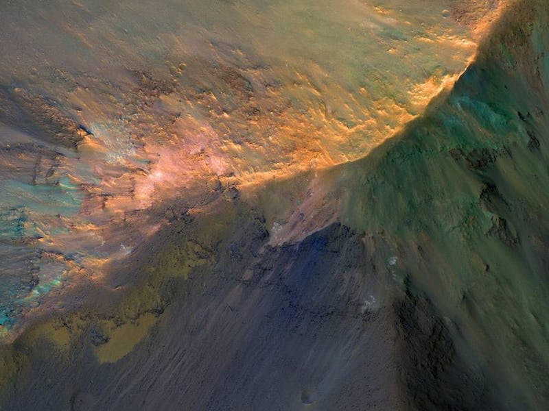 The orbiter’s mission is to take extreme close-up shots of the Martian landscape to study the mineral composition and trace the surface for any signs of water. In this image of the sun-soaked and sandy swept hills, MRO shows that the red planet is not so red after all. Although the image is color-enhanced, it’s the diverse minerals embedded into the surface that is thought to primarily account for the incredible variety of shades and tones streaked across the canyon.