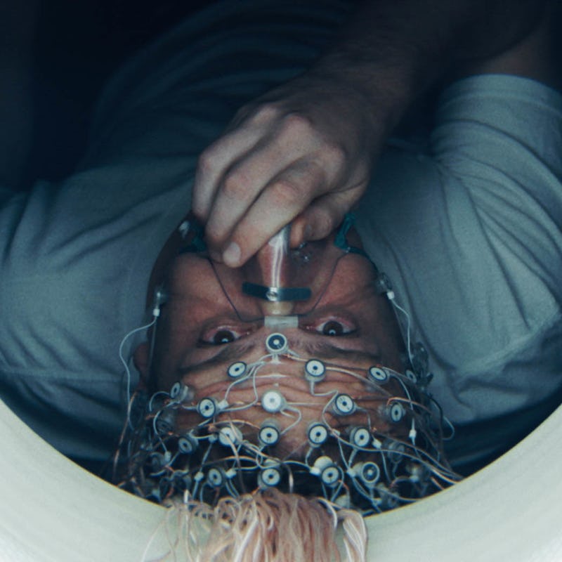 Robert Redford attempts to access the afterlife with a complicated tangle of electrodes in 'The Discovery.'
