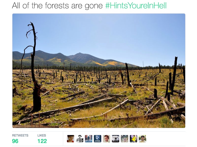 “All of the forests are gone,” reads the tweet, followed by “#HintsYoureInHell.” A photograph below the text shows a grim scene: an expanse of leafless stumps and fallen tree trunks.