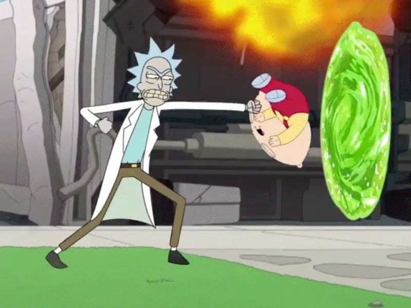 If you’re curious, the Family Guy footage comes from the 19th episode of the show’s 10th season, “Mr. and Mrs. Stewie,” while Rick hails from the series premiere and the first two episodes of the second season, with the last shot of Butthole World coming from Season 2, Episode 5.