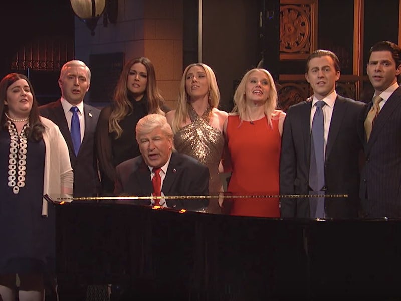 As the Donald played on, members of the SNL cast, dressed as their token White House characters, made their way to the stage to join in song. Almost everyone was there: Kate McKinnon’s Kellyanne Conway, Beck Bennett’s Mike Pence, and even a cameo from Scarlett Johansson as Ivanka Trump.
