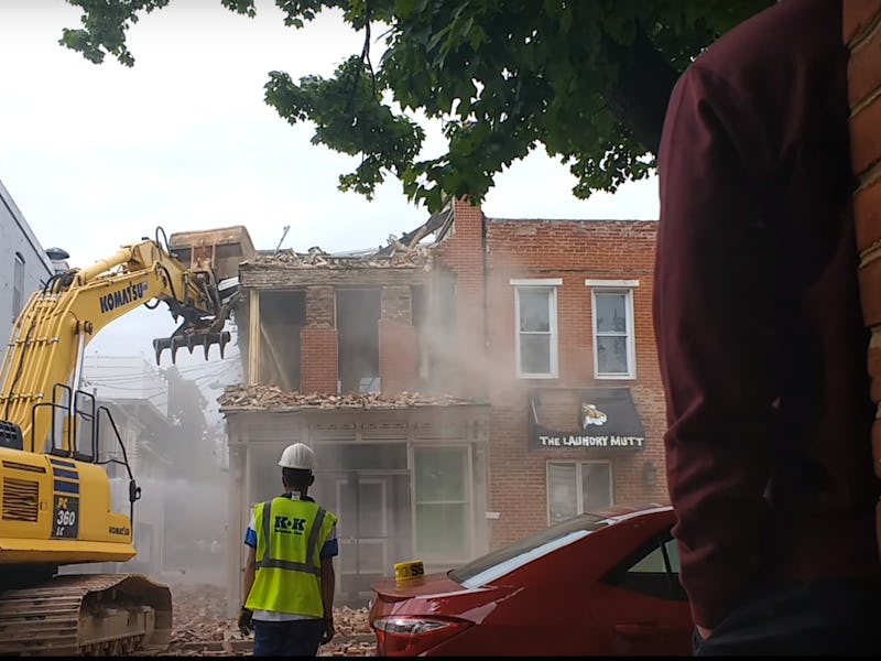 The building was a source of complaints from locals, who cited a large crack and a bowing exterior wall, and neighbors gathered around to watch the demolition crew and their excavator get to work. Everything seemed to be going fine, when, suddenly, a nudge from the excavator’s plow sent a loose, third-story wall tumbling over onto the adjacent row house.