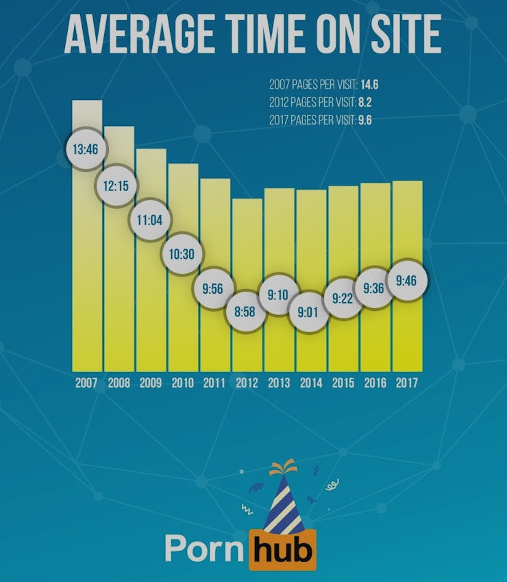 One of the more intriguing bits of that analysis came with regards to how long people spend on Pornhub per visit. Despite growing to 75 million daily users and sporting 10 million videos uploaded in 2017, the average time that users spend on the site has actually decreased.