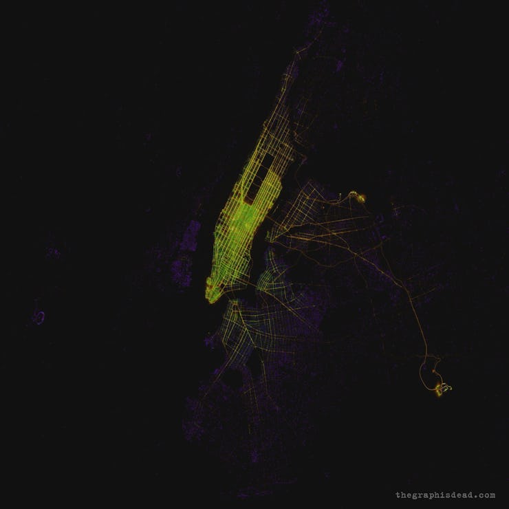 Basically, Uber is purple, cabs are orange, and the overlap between the two is green. It makes clear that Uber dominates the outer boroughs of Queens and Brooklyn, where taxis are a little harder to hail on the street. In Manhattan, which is positively pulsating with neon green transit options, cabs are easy to hail, but many people opt for Uber anyway.