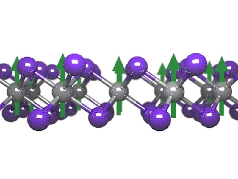 The magnet is made of a compound called chromium triiodide, which Jarillo-Herrero and Xu found retained its magnetism even at wildly thin dimensions. (The magnet isn’t actually 2-D, it’s one atom thick, but that’s about as 2-D as it gets.) That’s because chromium triiodide is a ferromagnet, a metal that permanently generates a magnetic field because of the way its electrons spin.