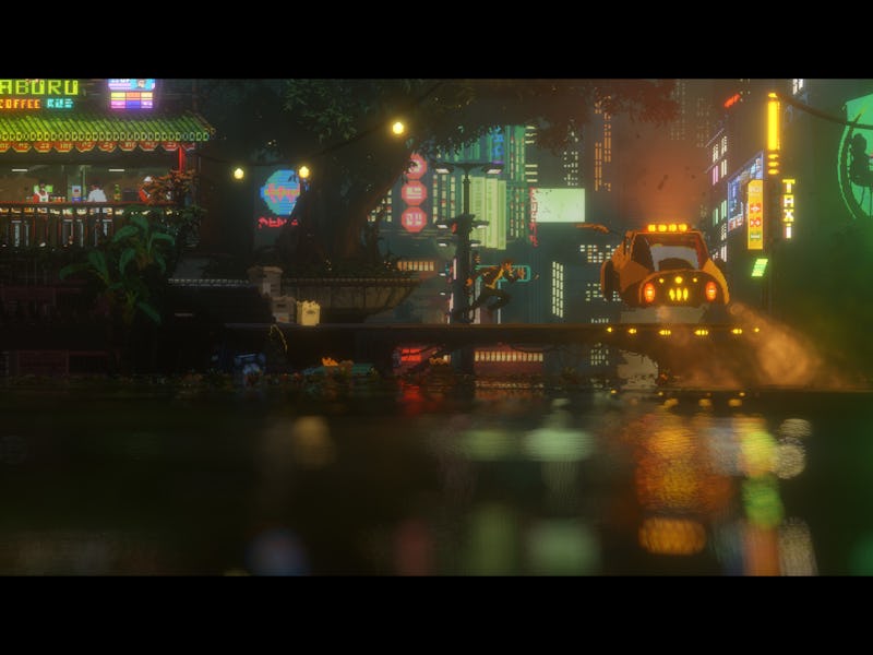 As revealed during Microsoft’s conference at E3 2017, The Last Night is an eye-catching platformer that blends cinematic 3D visuals with flat, Atari-age 2D avatars in bleak-but-colorful environments. Based on its trailer, which is just a minute and twenty seconds long, it’s clear Soret and his team Odd Tales were influenced by dystopian sci-fi like Akira, Blade Runner, the original Ghost in the Shell, and novels like Isaac Asimov’s I, Robot. With its rainy streets, orange-and-teal palettes, and neon signage fogged by pollution, The Last Night spins familiar imagery with a retro twist, creating something visually fresh.