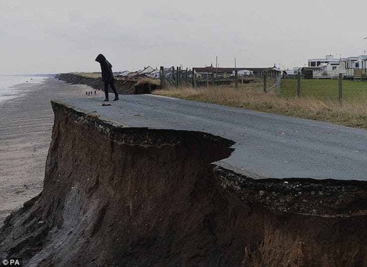 In 2013, researchers from the UK’s Marine Climate Change Impacts Partnership reported that “it is very likely that currently eroding stretches of coast will experience increased erosion rates due to sea-level rise,” though they noted that the erosion process is not well understood. There’s plenty of evidence for it, however: Land surveys performed by researchers at the University of Hull show that erosions along Holderness Coast can average anywhere from 1 to 10 feet in one year. It’s understood that the soft cliffs aren’t solid rock formations — they’re a composite of clay, silt, sand, gravel, cobbles and boulders deposited by glaciers — and that they slowly erode every time a wave hits. Over time, the base loses its ability to support the top of the cliff, and it falls down in a landslide.