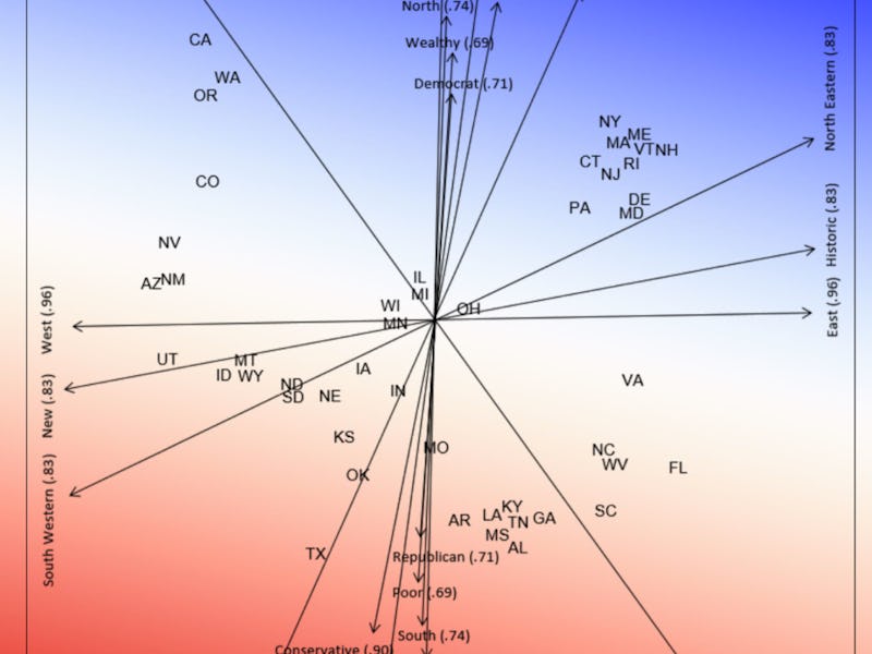 The resulting cognitive map shows some unusual clusters of states, dividing along both geographic and socioeconomic axes. Here’s one of those maps: