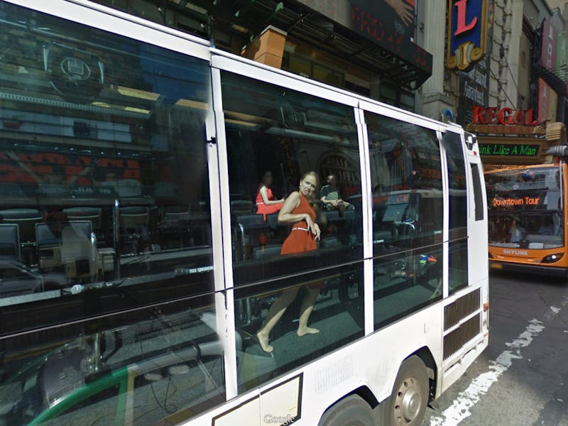 In 2014, for example, this unlucky woman was blind-sighted by the Google Street View car while barefoot in a bus near Times Square. Other Street View images reveal the vehicle is owned by tour company The Ride. Odds are Google’s nine-eyes probably caught this lady during some downtime between round-the-clock tours of New York City landmarks.