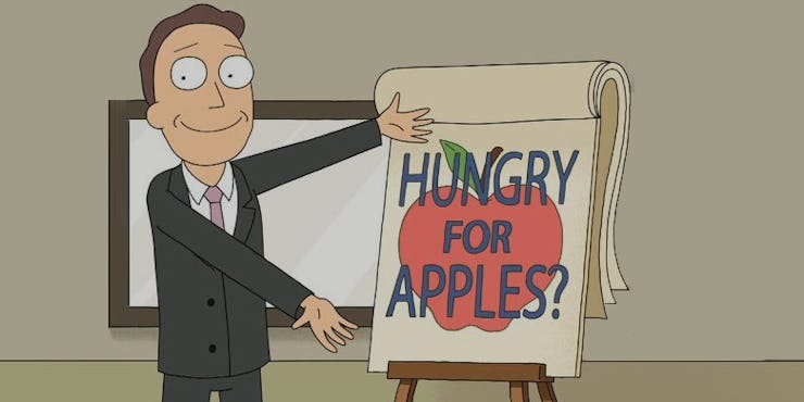 Well, look who’s laughing now? Jerry’s “Hungry for Apples?” ad is finally a real commercial. Adult Swim, which has been releasing a steady stream of delightfully weird claymation teasers for the upcoming third season of Rick and Morty, apparently made a live-action “Apples” commercial as well. The video was posted by YouTube user “Not Justin Roiland,” so it’s definitely not the real series co-creator Justin Roiland. Wink.