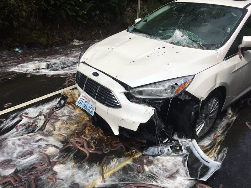 Update: Kelsey Kennedy at Atlas Obscura points out that the eels are actually hagfish, creatures which secrete the white goo visible in the photos when they’re in distress. Kennedy reports, “Slime from just one hagfish can grow to five gallons, which means things got pretty gross when cleanup crews took hoses to the mess.” That means the sheer panic experienced by the slimy creatures was made tangible all over Oregon. Anyone driving through the mess was getting fear-goo all over their tires.