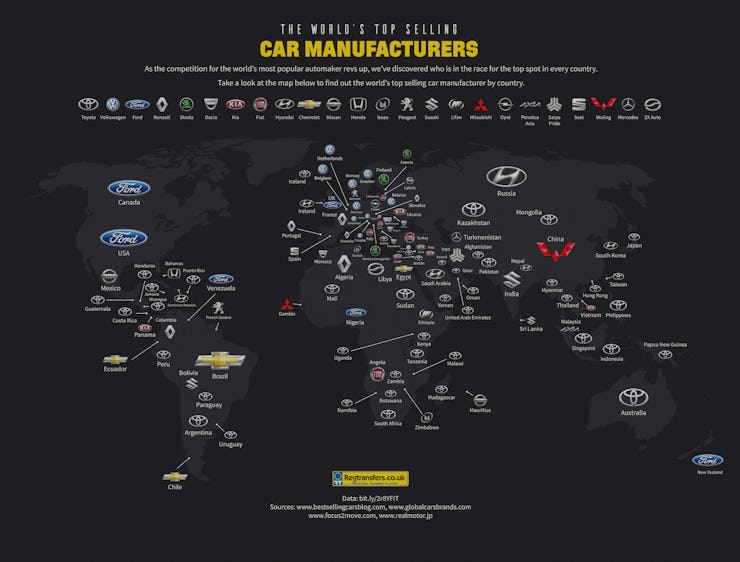 A map of 2016 car sales data shows that while Ford was the strongest car brand in the United States, the United Kingdom, and Canada, Toyota’s interlocking ellipses logo was omnipresent in almost 50 countries, especially those in South America, Africa, and Southeast Asia.