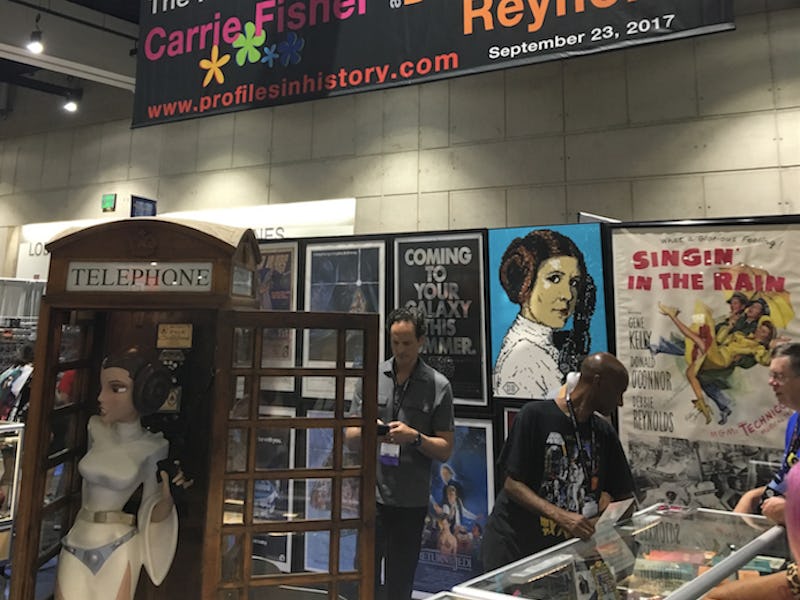 The auction house Profiles in History will auction off about 1500 items from the estate of the late Carrie Fisher and Debbie Reynolds in September, and is using Comic-Con to build buzz for the sale. The company rented a large booth on the convention center floor to display some of the most personal, poignant — and particularly relevant — of the items to be auctioned, dragging down everything from signed Star Wars posters to tokens from a childhood in the spotlight. Fisher died at the age of 60 late last year, after suffering a massive heart attack on a flight from London to Los Angeles; Reynolds, her mother, died at 84 just a day later.