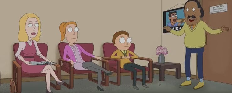 Nobody actually says the term in the latest promo for Rick and Morty Season 3, but when Beth, Summer, and Morty bump into Mr. Goldenfold while waiting for a family therapy session, Morty’s math teacher excitedly says, “Oh! The Smith family minus a dad! How long have you all been eating poop?”