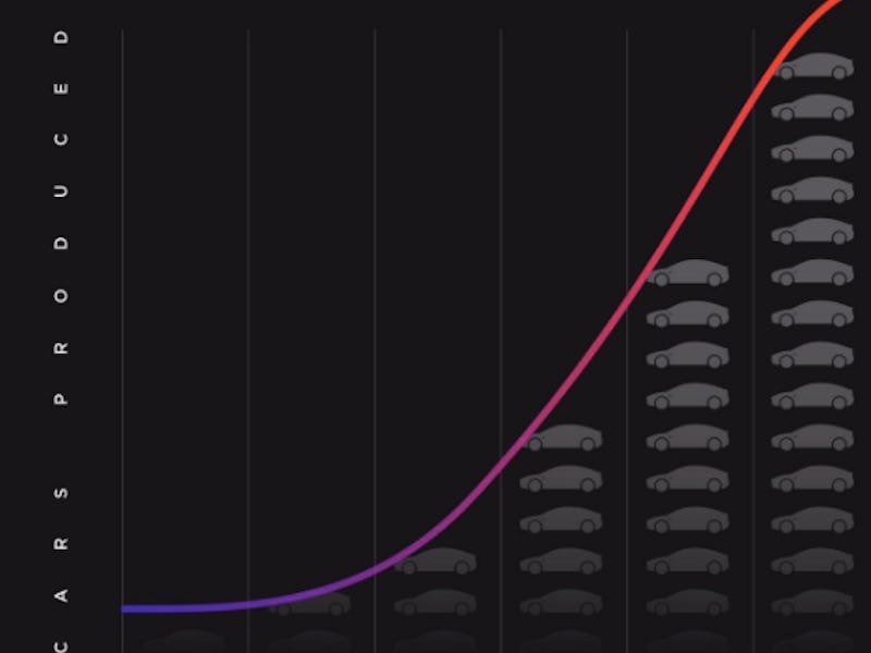 The sleekly-designed graph shows the Model 3’s “s-curve” of production — implying with more time, there will be more cars (literally the bars of the graph are made of cars).
